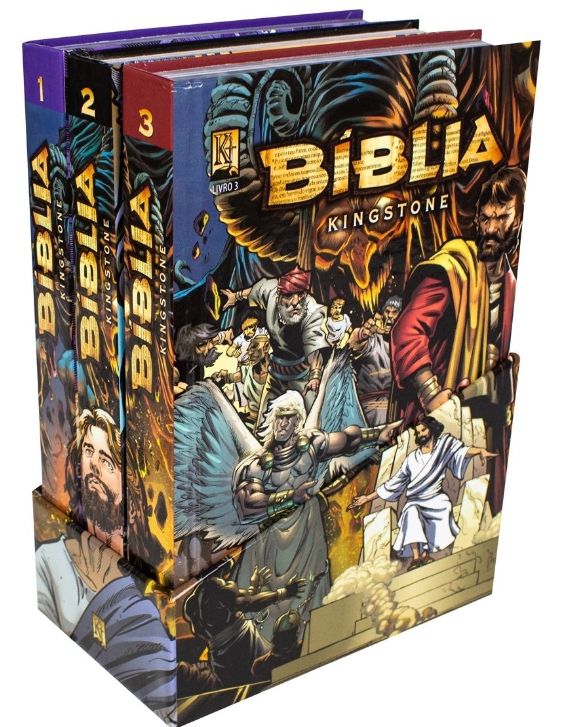 A Bíblia Kingstone é a mais completa adaptação gráfica da Bíblia já publicada. Em três volumes, a obra apresenta os 66 livros da Bíblia – de Gênesis a Apocalipse – ilustrados em quadrinhos e em ordem cronológica. Com mais de duas mil páginas, o livro reúne mais de dez mil desenhos artísticos que impressionam por sua dramaticidade. Eles foram produzidos por mais de 40 artistas reconhecidos pela indústria dos quadrinhos, incluindo Kyle Hotz (Capitão América e Homem Aranha), Christopher Ivy (Demolidor, Vingadores e Hulk), Emily Kanalz (Homem Aranha e X-Men), entre vários outros artistas com diversos trabalhos publicados pela Marvel Comics e DC Comics. Com linguagem simples e fiel aos originais, todos os gêneros da Bíblia estão bem apresentados, graças ao trabalho de escritores premiados, reconhecidos por sua expertise em narrativa de quadrinhos, que se encarregaram de fazer as adaptações das histórias da Bíblia. Cada episódio é identificado com a referência do texto bíblico correspondente na Nova Almeida Atualizada (NAA). Esta é uma maneira criativa de colocar a Bíblia nas mãos, mente e coração das pessoas. Trata-se de uma obra monumental que vai atrair leitores de todas as idades para a mensagem bíblica e, de forma especial, as novas gerações. Coedição entre Sociedade Bíblica do Brasil e Editora 100% Cristão, os volumes da Bíblia Kingstone vêm acondicionados em um único box. Confira, a seguir, o conteúdo de cada volume: • Vol. 1: A impressionante história da criação; o período dos patriarcas e da fundação de Israel; o Êxodo e os Dez Mandamentos; o tempo dos juízes; Rute, Samuel e o reinado de Davi. • Vol. 2: A transição do reino de Israel de Davi para Salomão, abrangendo a sucessão dos reis de Judá e Israel; o Exílio Babilônico; e a história de cada um dos profetas maiores e menores; o período intertestamentário. • Vol. 3: A mais completa adaptação gráfica da vida de Jesus Cristo já feita, abrangendo também o início da Igreja no livro de Atos, a vida épica de Paulo de Tarso e cada uma das epístolas, encerrando com a impressionante turnê visual do livro de Apocalipse.